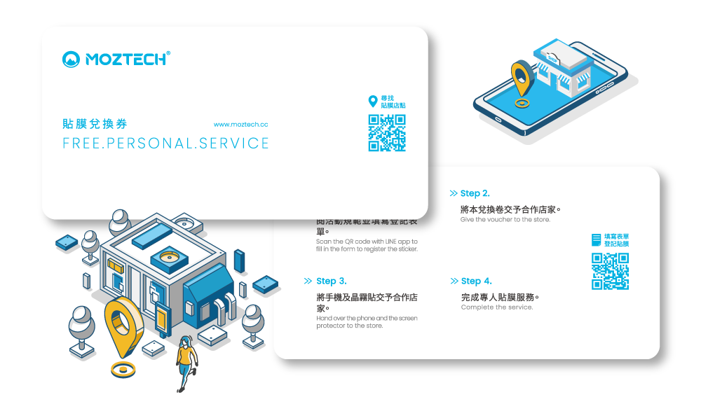 凡購買MOZTECH晶霧貼系列產品,憑貼膜兌換券,可至實體經銷店換取,專人免費貼膜服務