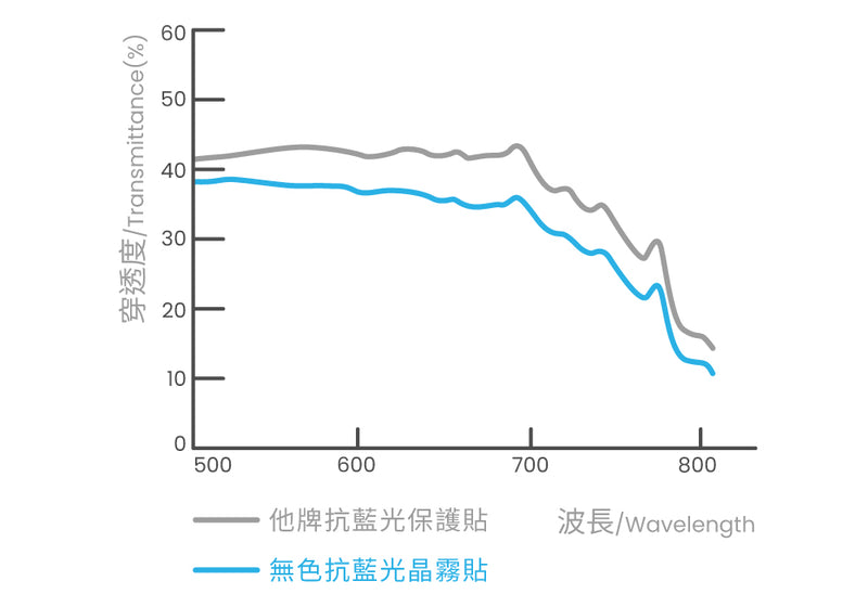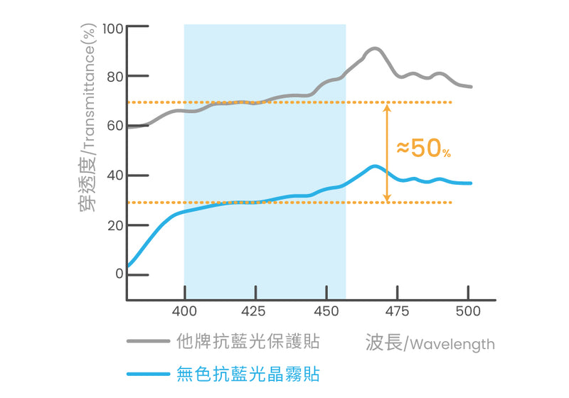 在實驗室內,以不同波段的光線直射,測試其穿透率,可見使用MOZTECH無色抗藍光晶霧貼後大幅阻擋有害藍光高達50%