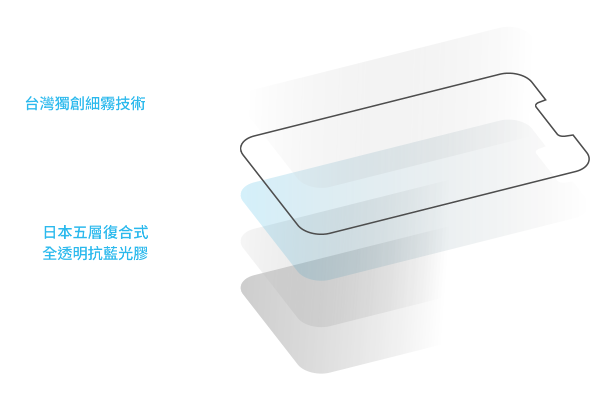 選用日本進口五層復合式全透明抗藍光膠,阻隔有害藍光,保留有益藍光,並加強最具傷害性藍光波段的阻絕。在防護藍光同時,依然保持高透不泛黃!